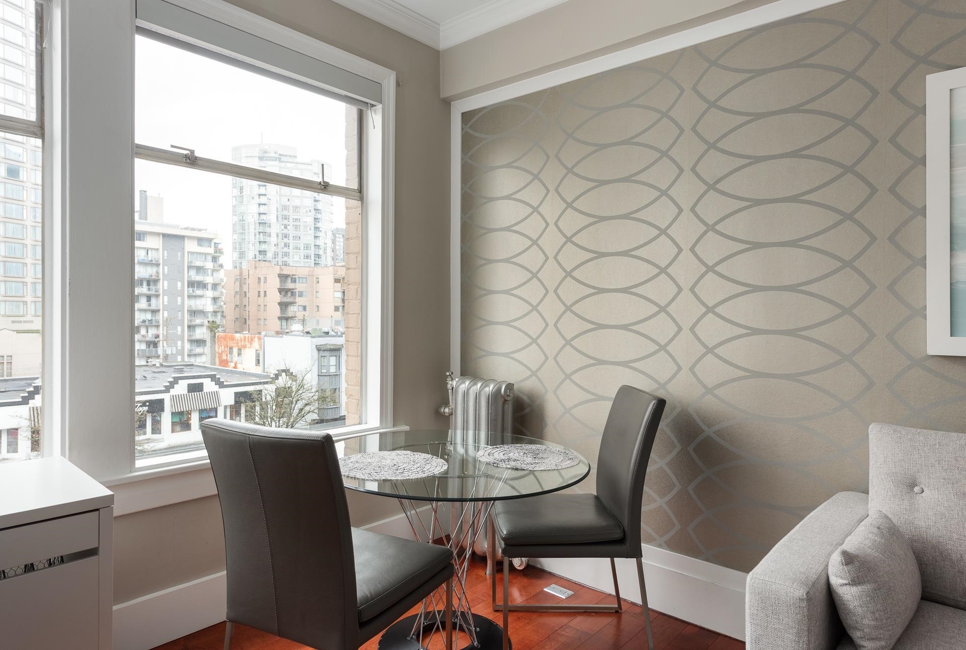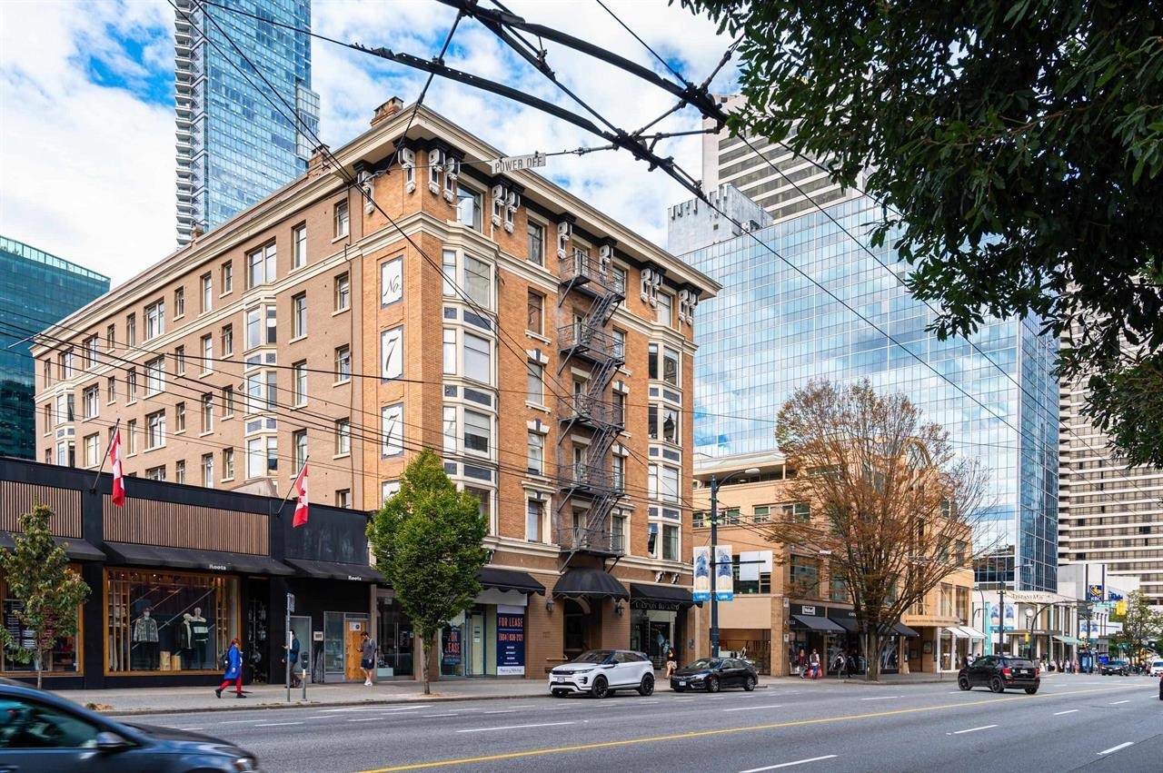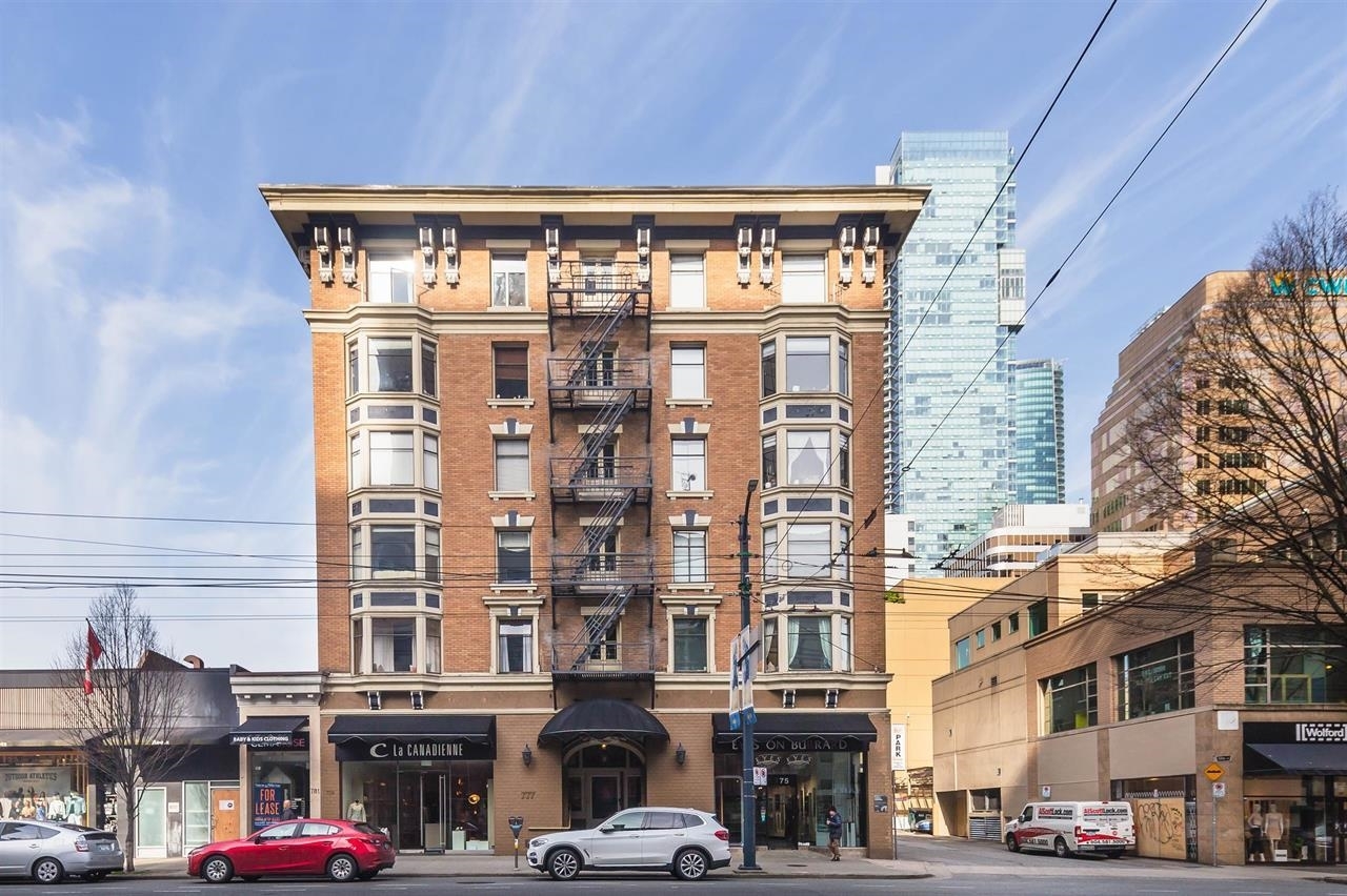 Step into a rare gem of Vancouver's history at 777 Burrard Street nestled within a beautifully preserved six-story 1914 heritage building. Lovely one bedroom suite blends the charm of yesteryear with modern elegance, offering a unique living experience in one of the city's most coveted locations. 9' ceilings immediately enhance the spaciousness of the open-plan kitchen and living area. A pretty kitchen features custom-designed cabinetry. Every detail has been meticulously crafted, from the sleek California Closets built-ins to the expansive marble bathroom. Large windows flood the spacious bedroom with natural light. Just steps from the best shops and restaurants, this well maintained, re-piped building offers the convenience of a live-in caretaker. Don't miss this exclusive chance.