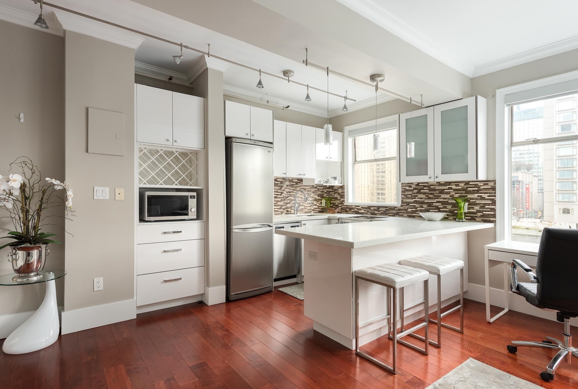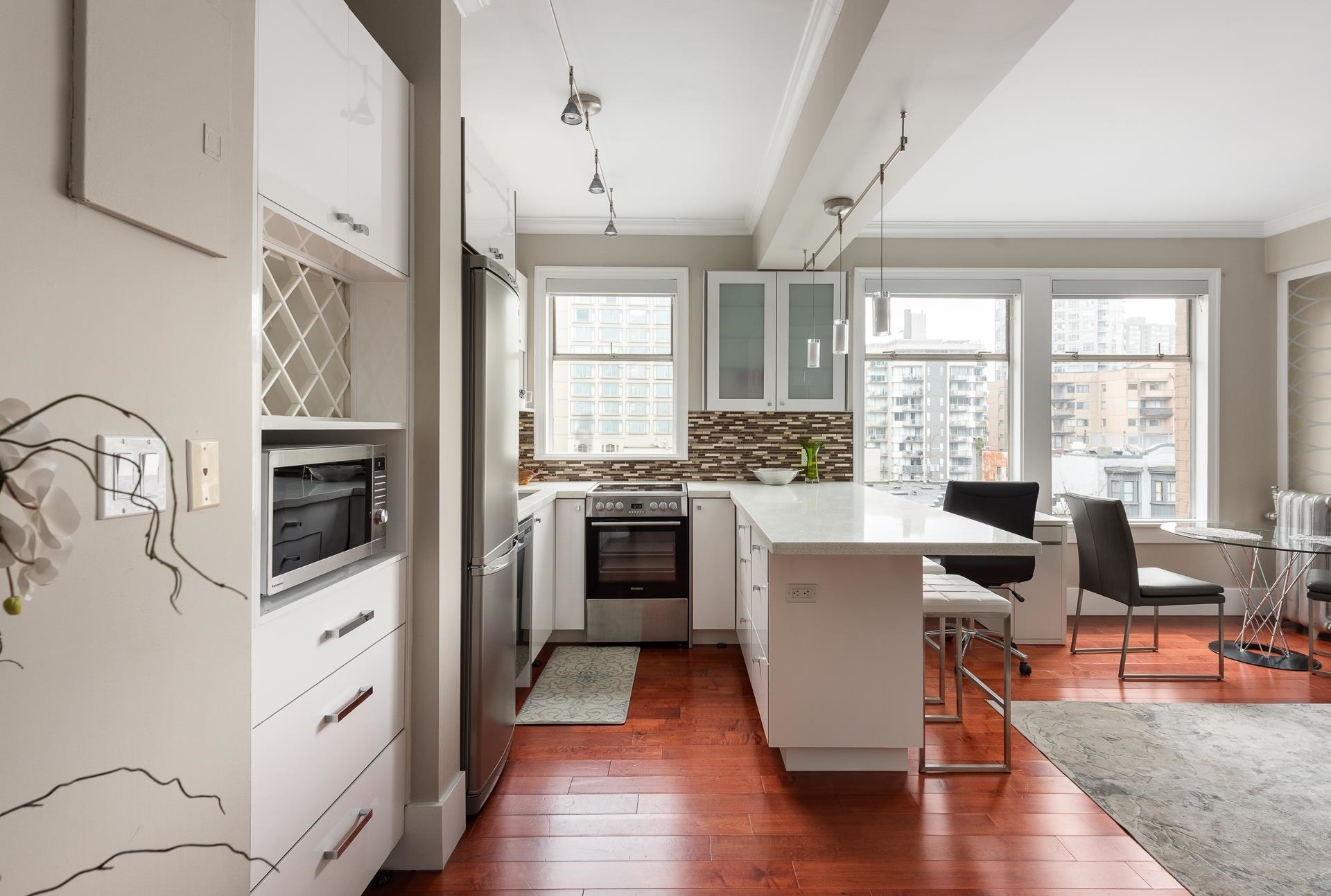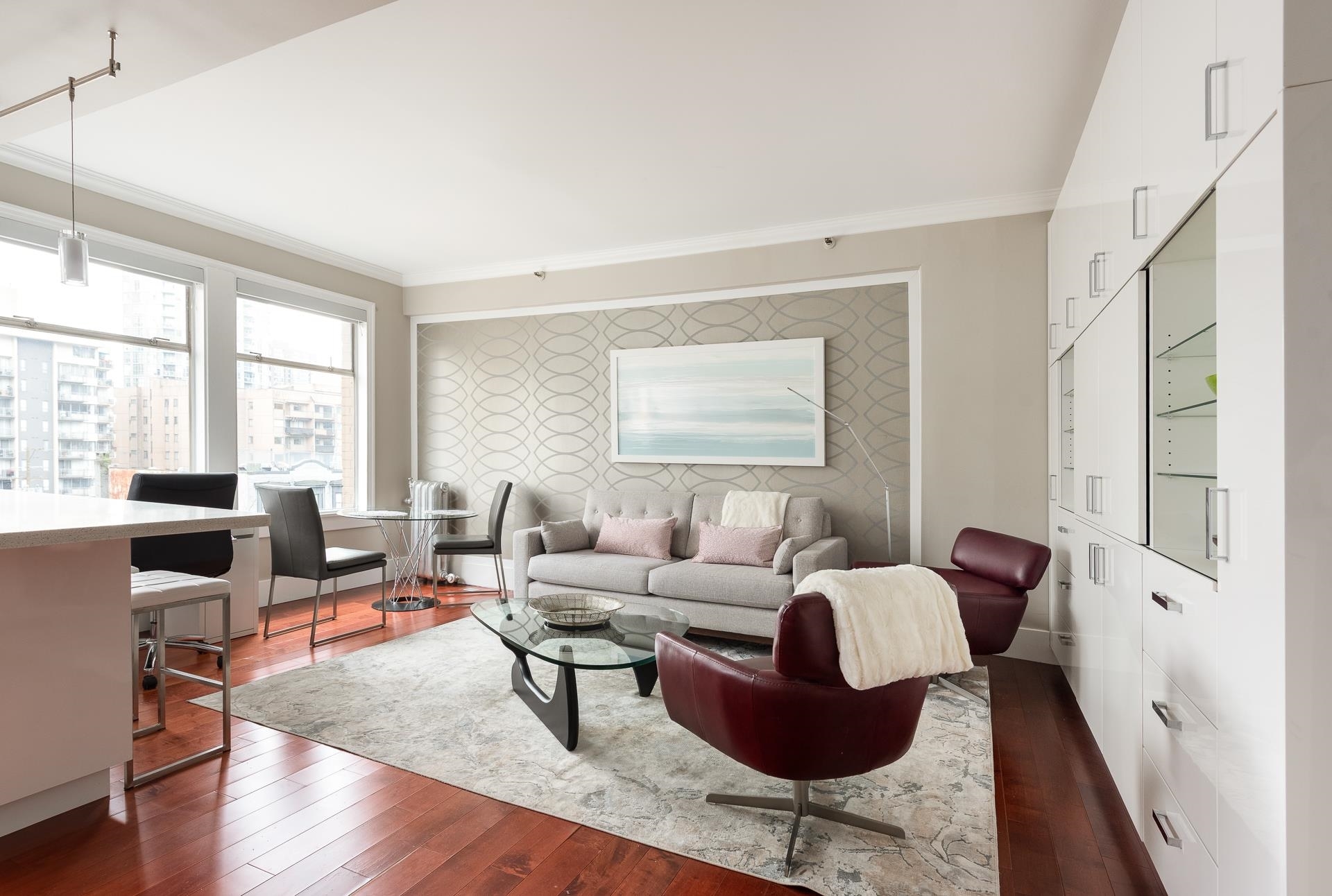 Step into a rare gem of Vancouver's history at 777 Burrard Street nestled within a beautifully preserved six-story 1914 heritage building. Lovely one bedroom suite blends the charm of yesteryear with modern elegance, offering a unique living experience in one of the city's most coveted locations. 9' ceilings immediately enhance the spaciousness of the open-plan kitchen and living area. A pretty kitchen features custom-designed cabinetry. Every detail has been meticulously crafted, from the sleek California Closets built-ins to the expansive marble bathroom. Large windows flood the spacious bedroom with natural light. Just steps from the best shops and restaurants, this well maintained, re-piped building offers the convenience of a live-in caretaker. Don't miss this exclusive chance.