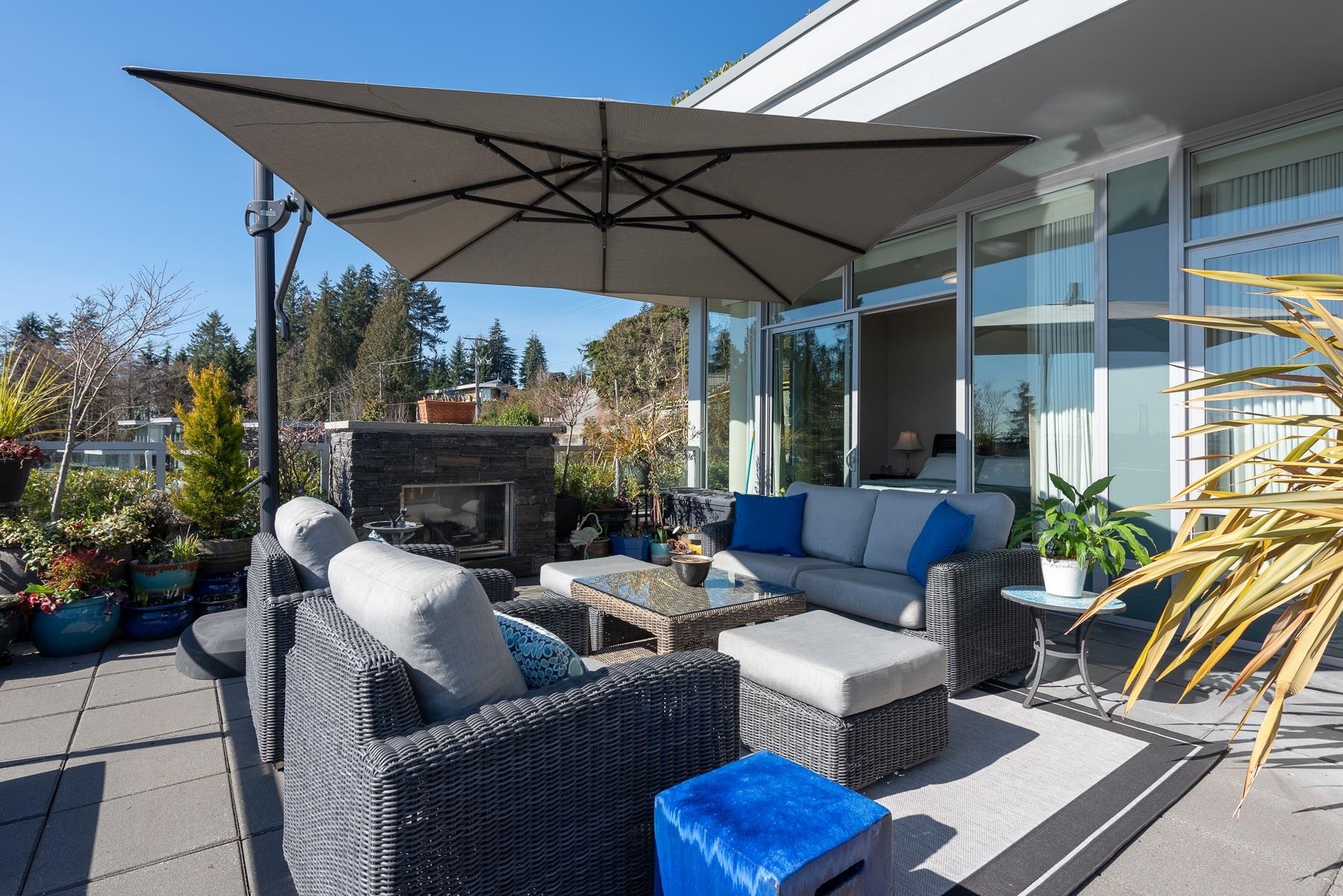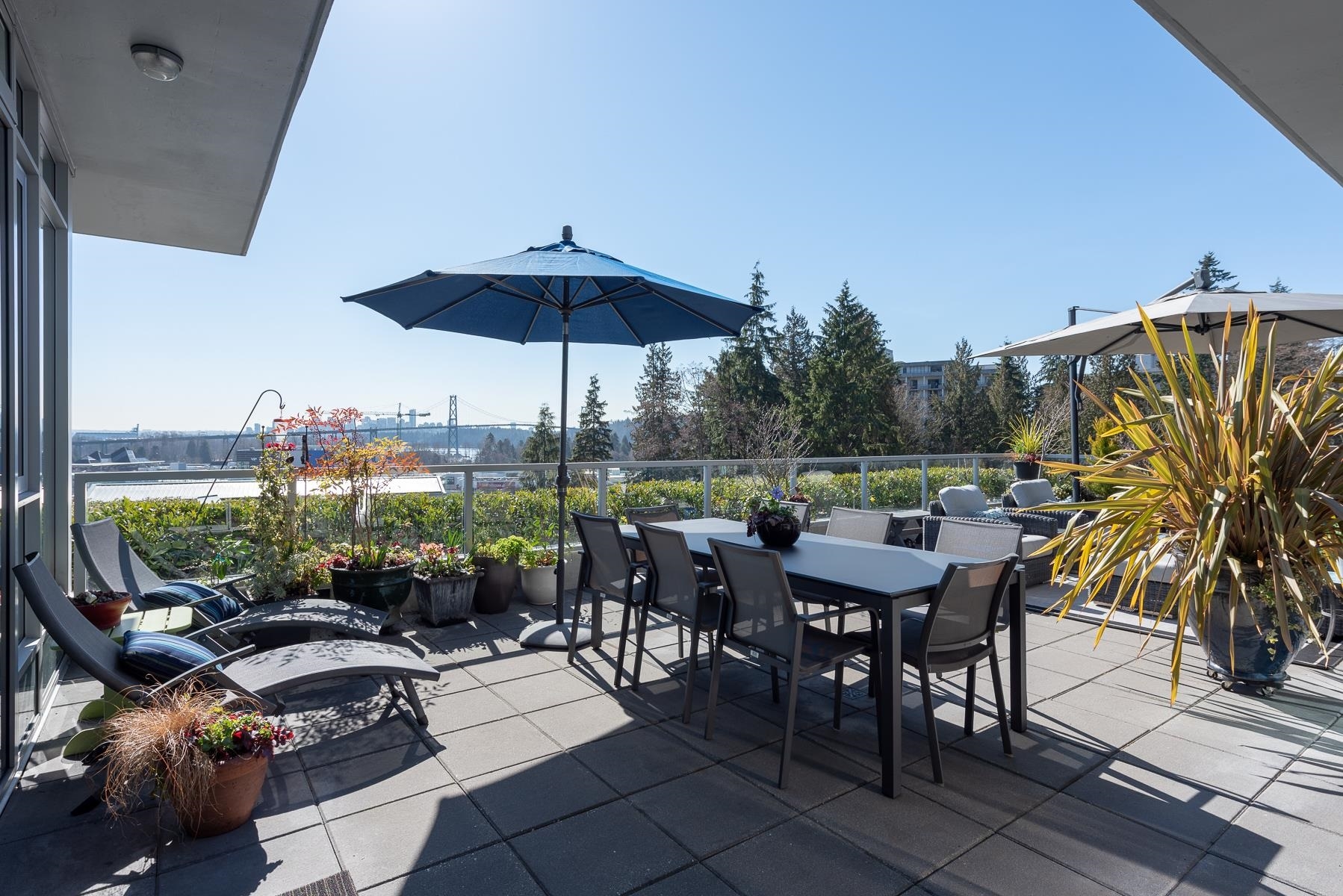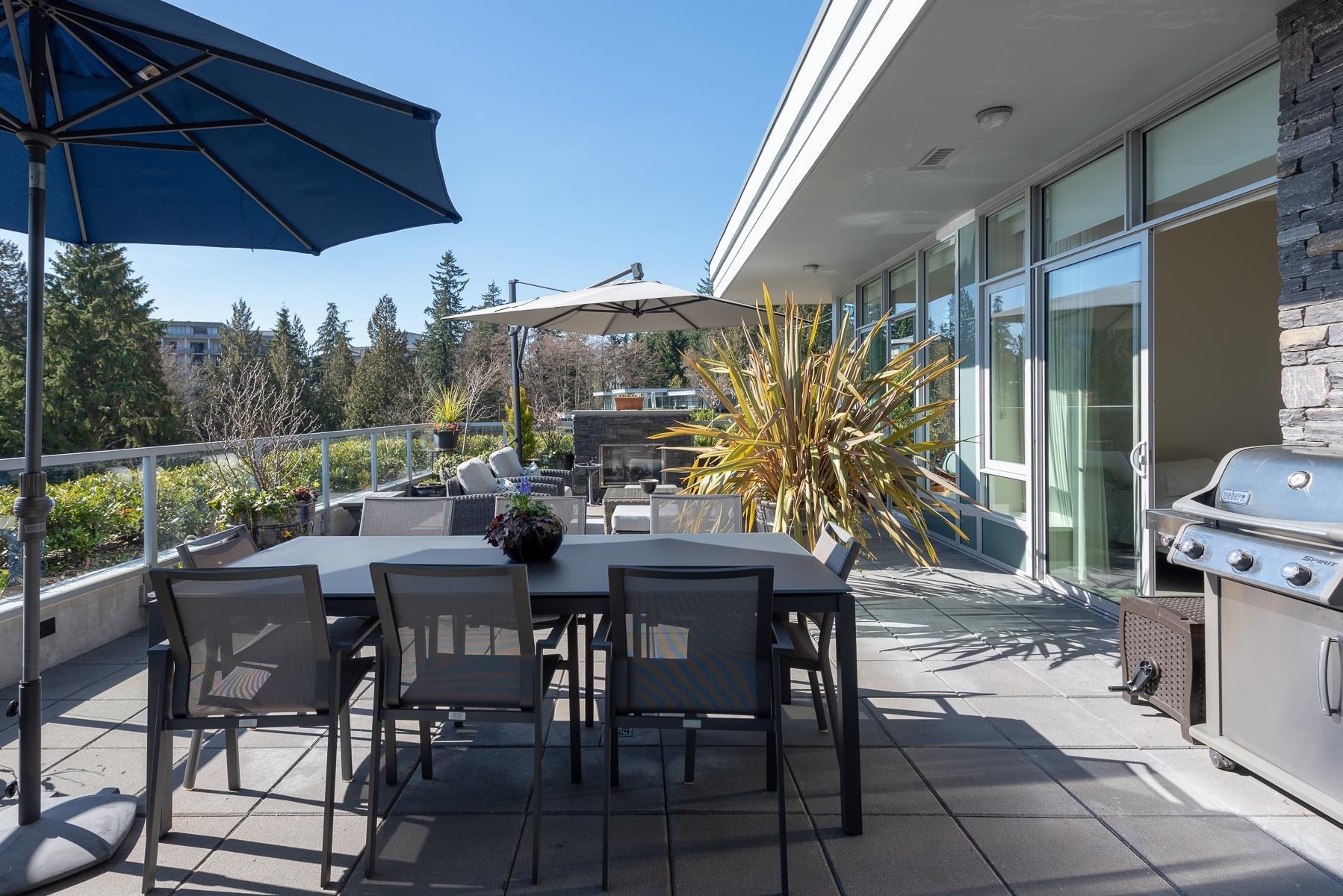 Designed by Arthur Erickson and perched above Park Royal with captivating views, this is the ultimate in adult living. South facing floor to ceiling windows open onto a 725 sqf landscaped framed terrace and a perfect floor plan offers total private plus stunning views from every room. This 2 bedroom + den sub-penthouse is a down-sizers dream with oak hardwood flooring, gourmet kitchen (Miele & Subzero), Control4 automated lighting, blinds & sound, heat pump with AC, two gas fireplaces (one outside), private double garage, two huge storage lockers plus more. Ideally located steps from walking trails, shops of Park Royal, Ambleside and WV Seawall plus public transit for quick access to Vancouver. This concrete designed development offers it all!