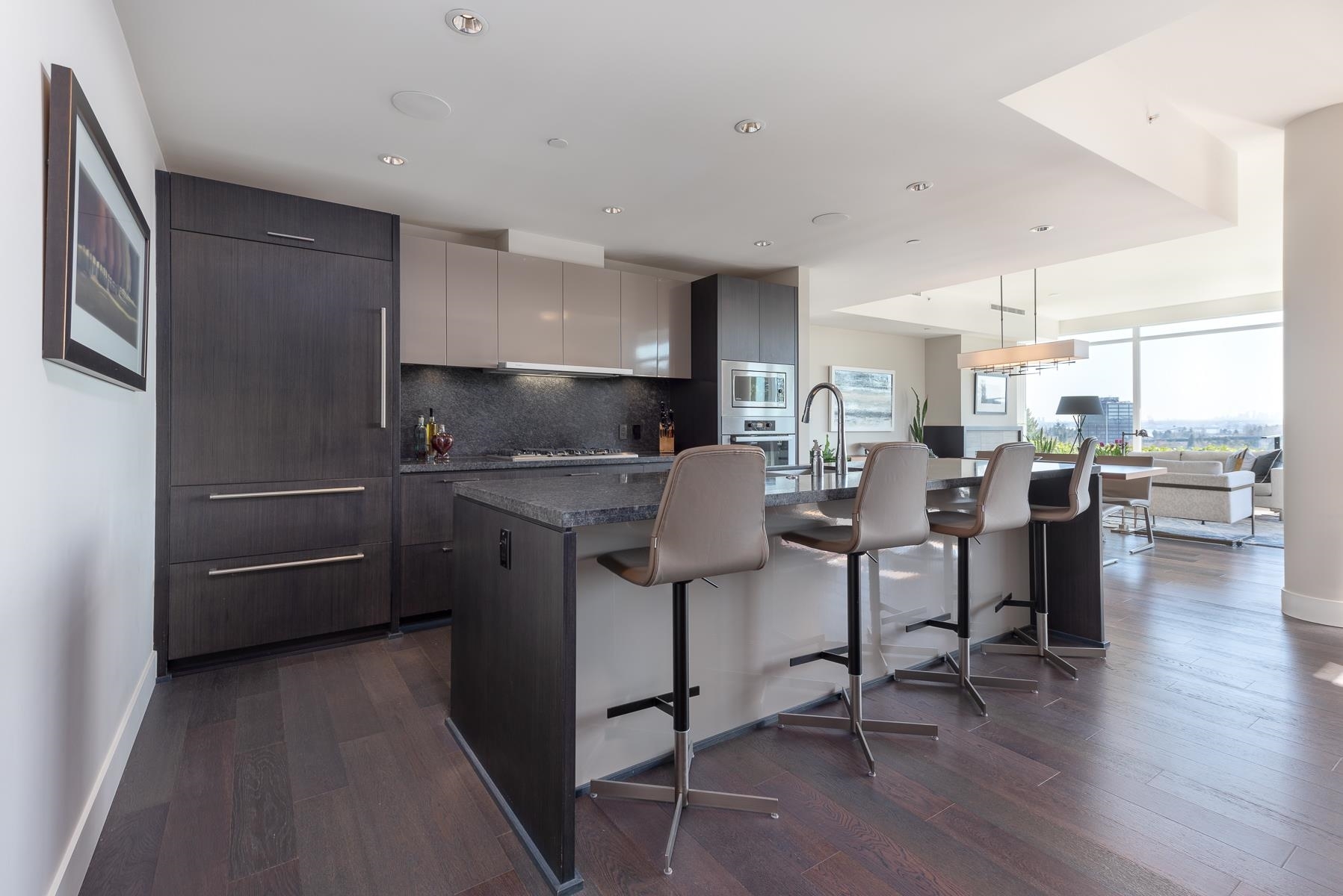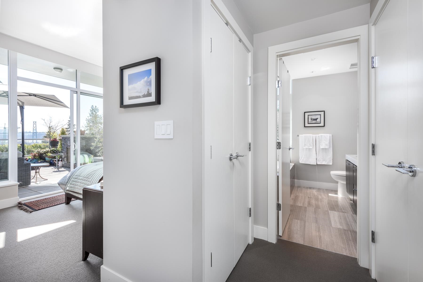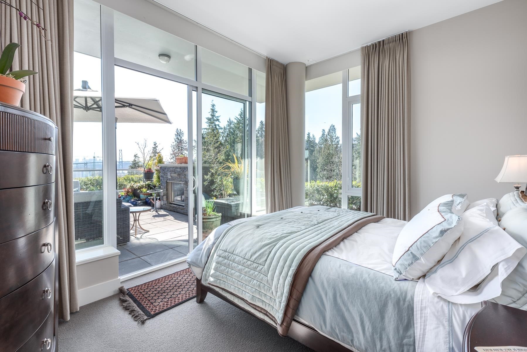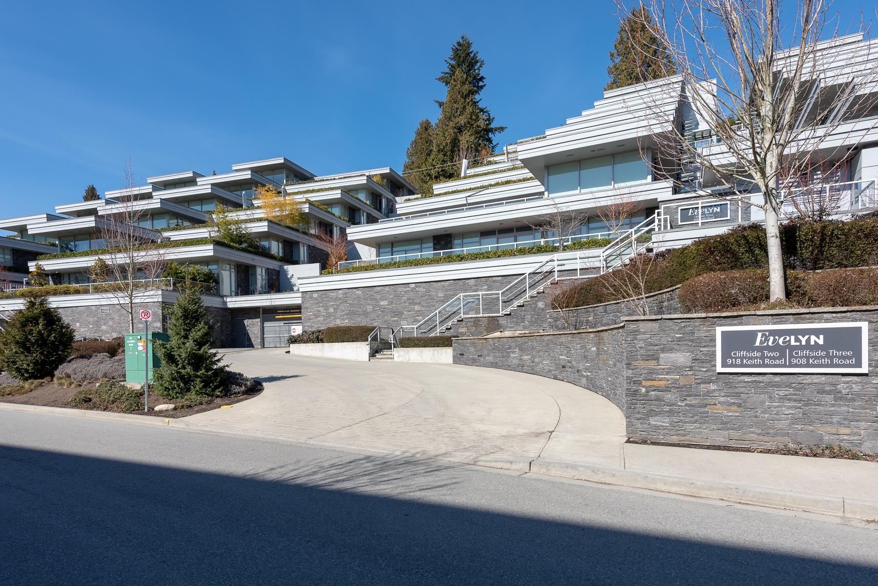 Designed by Arthur Erickson and perched above Park Royal with captivating views, this is the ultimate in adult living. South facing floor to ceiling windows open onto a 725 sqf landscaped framed terrace and a perfect floor plan offers total private plus stunning views from every room. This 2 bedroom + den sub-penthouse is a down-sizers dream with oak hardwood flooring, gourmet kitchen (Miele & Subzero), Control4 automated lighting, blinds & sound, heat pump with AC, two gas fireplaces (one outside), private double garage, two huge storage lockers plus more. Ideally located steps from walking trails, shops of Park Royal, Ambleside and WV Seawall plus public transit for quick access to Vancouver. This concrete designed development offers it all!